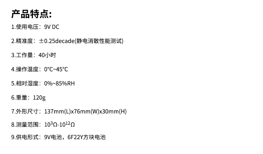 SL-030表面电阻测试仪遵循ASTM标准D-257测试方法,只需放置在需要测量物表面及按下红色按键,仪器上的十个(10³-10¹²)LED将其中一个测试数值亮起。测试时通过测试仪底部的两根平行电极快速地测试物体表面导电性能、表面静电消散性能及表面绝缘度。SL-030表面电阻测试仪测量**度高、操作简单、携带方便,是测量表面电阻的理想选择。